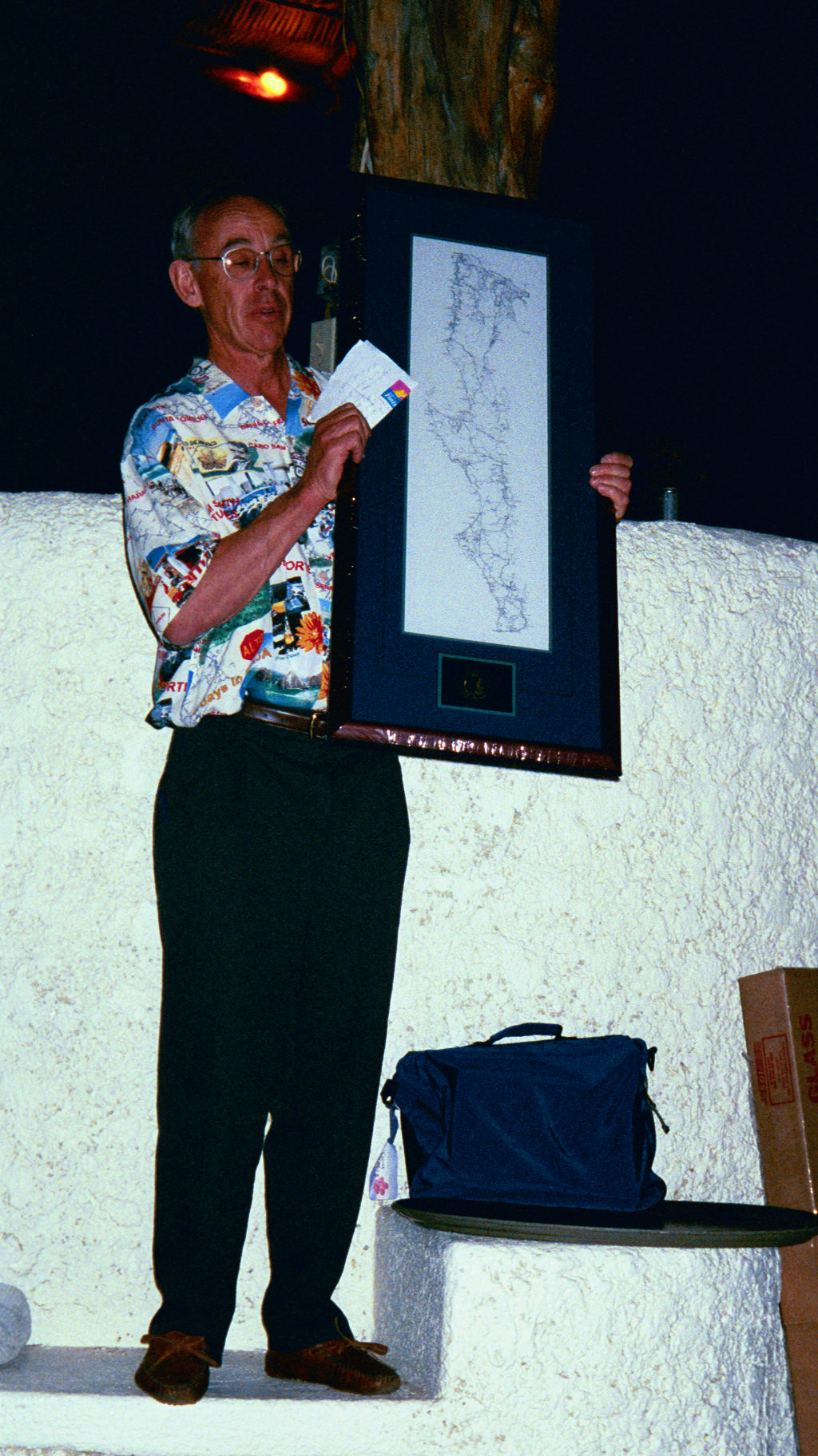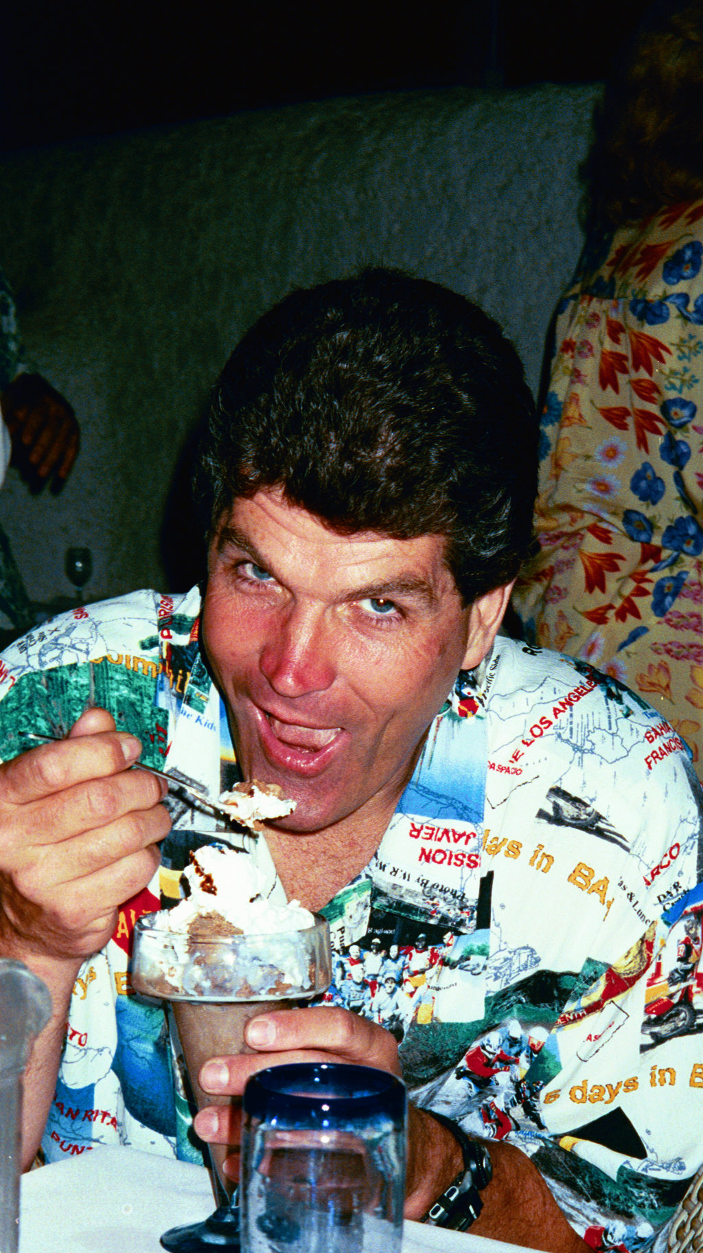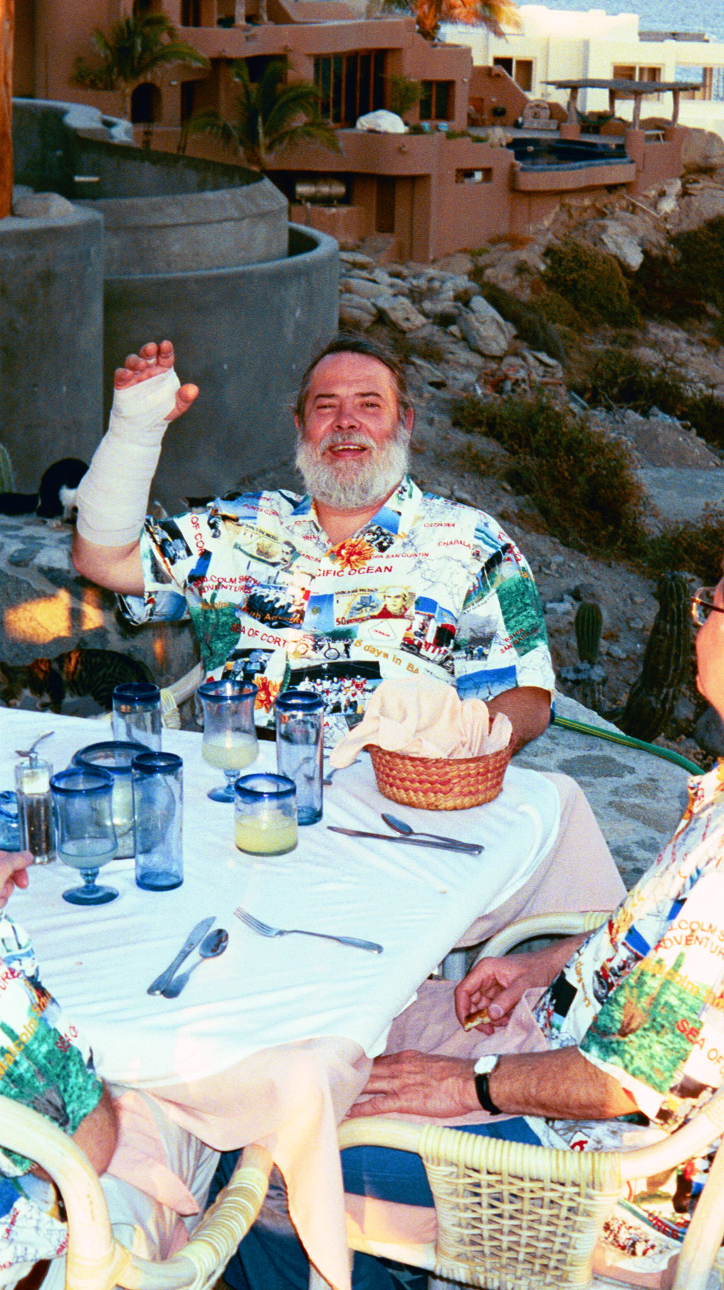Bill shows off his broken hand & wrist. He hit a wash-out about 70 miles from the finish.